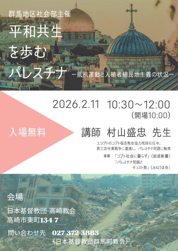 地区社会部主催、会場は高崎教会、日時は2月11日(水)10:30からです。